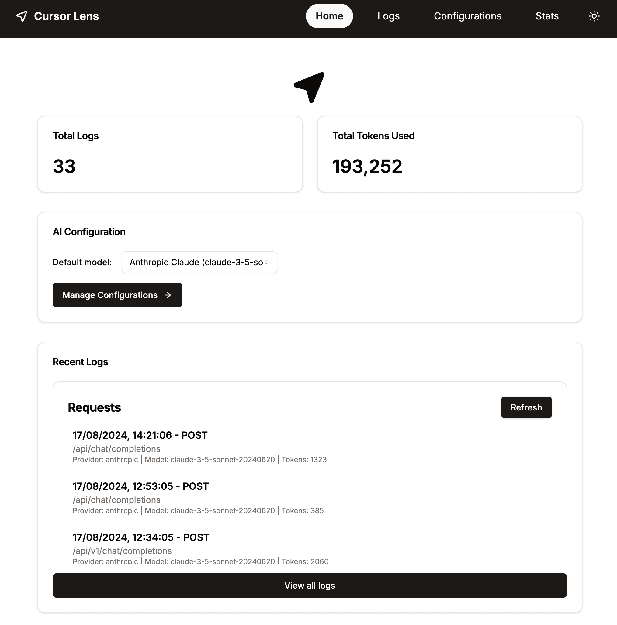 An open-source dashboard for Cursor.sh IDE. Log AI code generations, track usage, and control AI models (including local ones). Run locally or use upcoming hosted version.